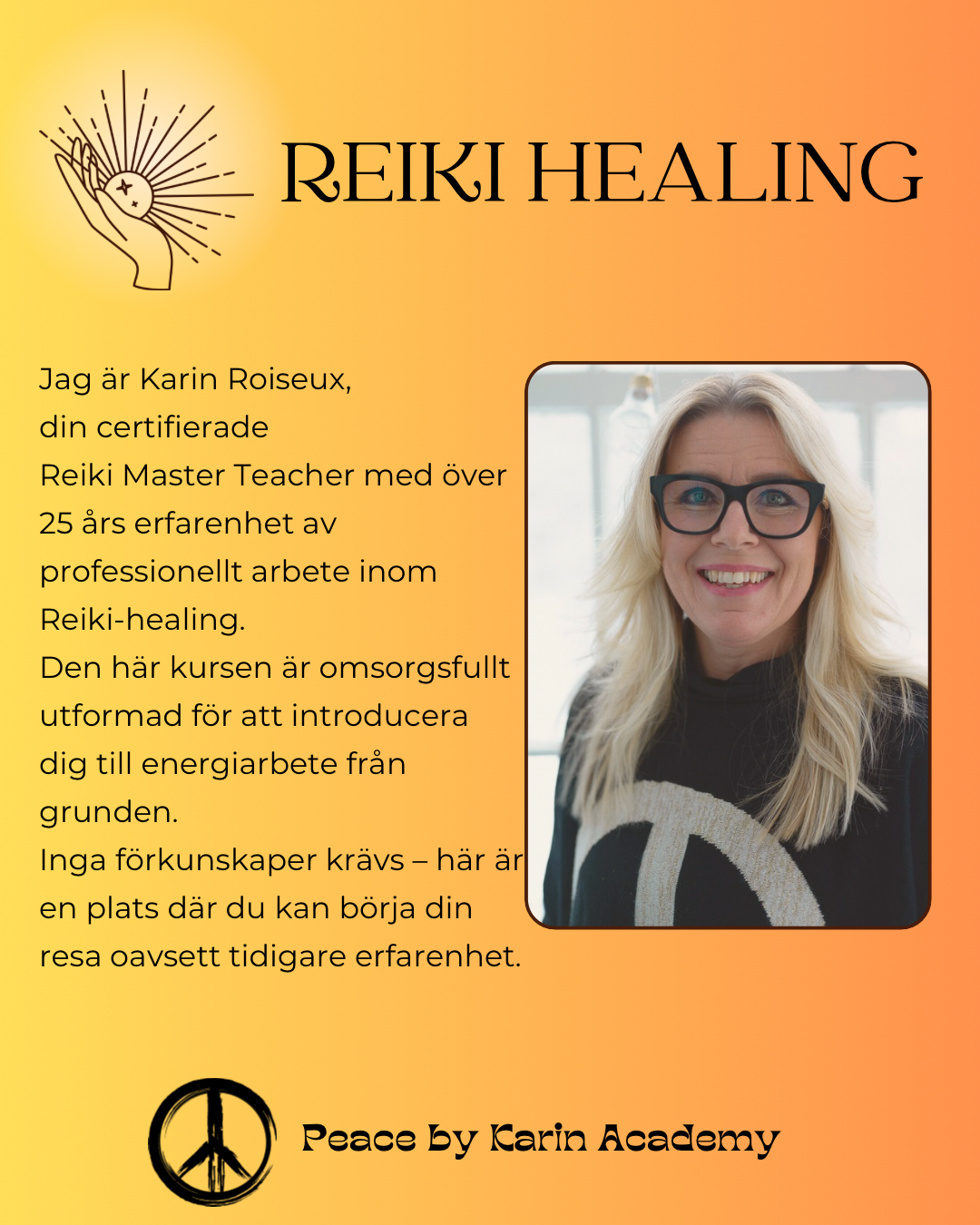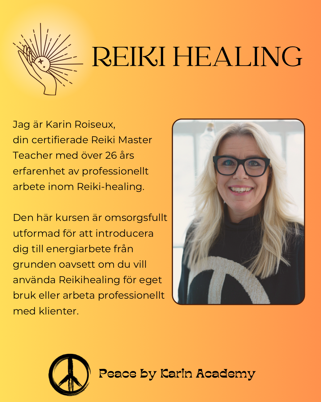 Denna kurs Àr designad för deltagare som redan har gÄtt igenom Reiki Healing steg 1 via Peace By Karin Academy och som Àr redo att ta nÀsta steg i sin resa mot inre balans och helande.
